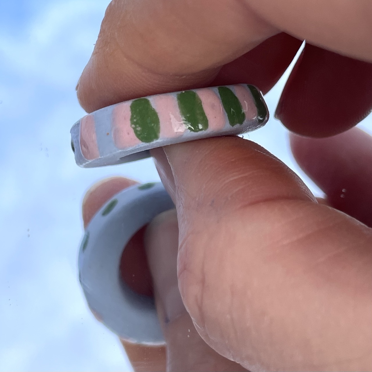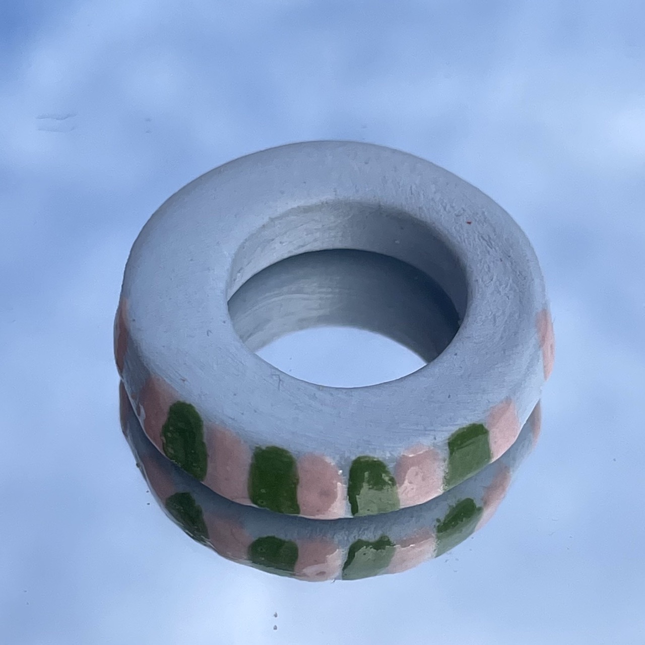 Discover the charm of our unique clay rings, handcrafted from high-quality blue earthenware clay and individually handpainted with vibrant glazes. Each ring features a one-of-a-kind design, inspired by the beauty of nature. This ring has two designs so you can turn it round to feature another pattern – two rings in one!